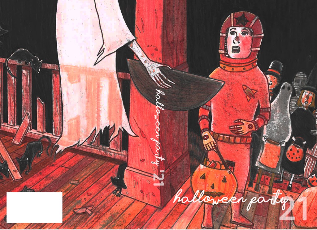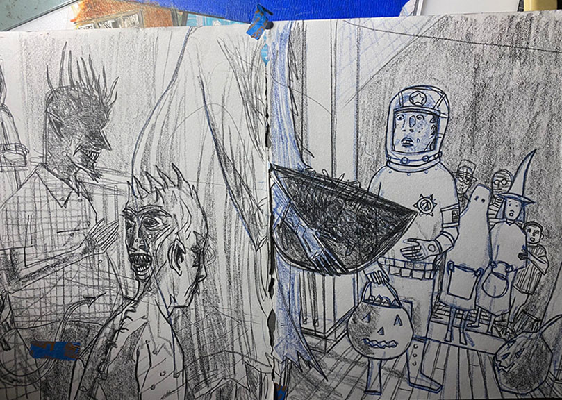 The original concept cover art for HALLOWEEN PARTY ’21 came to me fairly quickly. I’d been doing variations on the theme of kids approaching a spooky porch on All Hallow’s Eve for a few years, so I felt this subject would work well. This led to a few sketches prior to producing the final art.